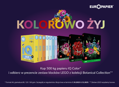 Kup 500 kg papierów IQ Color (A4) i odbierz zewstaw kloców lego z kolekcji Botanical Collection. Akcja sprzedażowa ważna jest w dniach od 1 paźdzernika 2025 do 5 grudnia 2025.