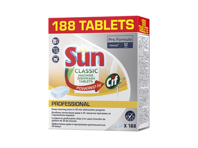 Tabletki do zmywarek Sun Pro Formula Classic zapewniające dokładne czyszczenie naczyń i ochronę szkła.