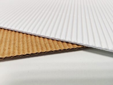 Czterowarstwowa tektura falista w kolorze białym (480 g/m2) lub brązowym (481 g/m2).
