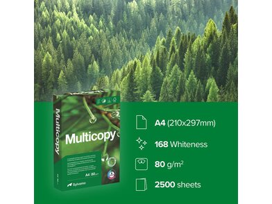 Multicopy to jasny, biały papier uniwersalny dla wszystkich maszyn biurowych. Ma wysoką wydajność i doskonałe rezultaty druku zarówno w kolorze, jak i czerni i bieli. Zapewnia przyjemne wrażenia wzrokowe i dotykowe. Idealny do tworzenia eleganckiej korespondencji firmowej, zaproszeń, pism przewodnich. Multicopy jest również idealny do preprintu.